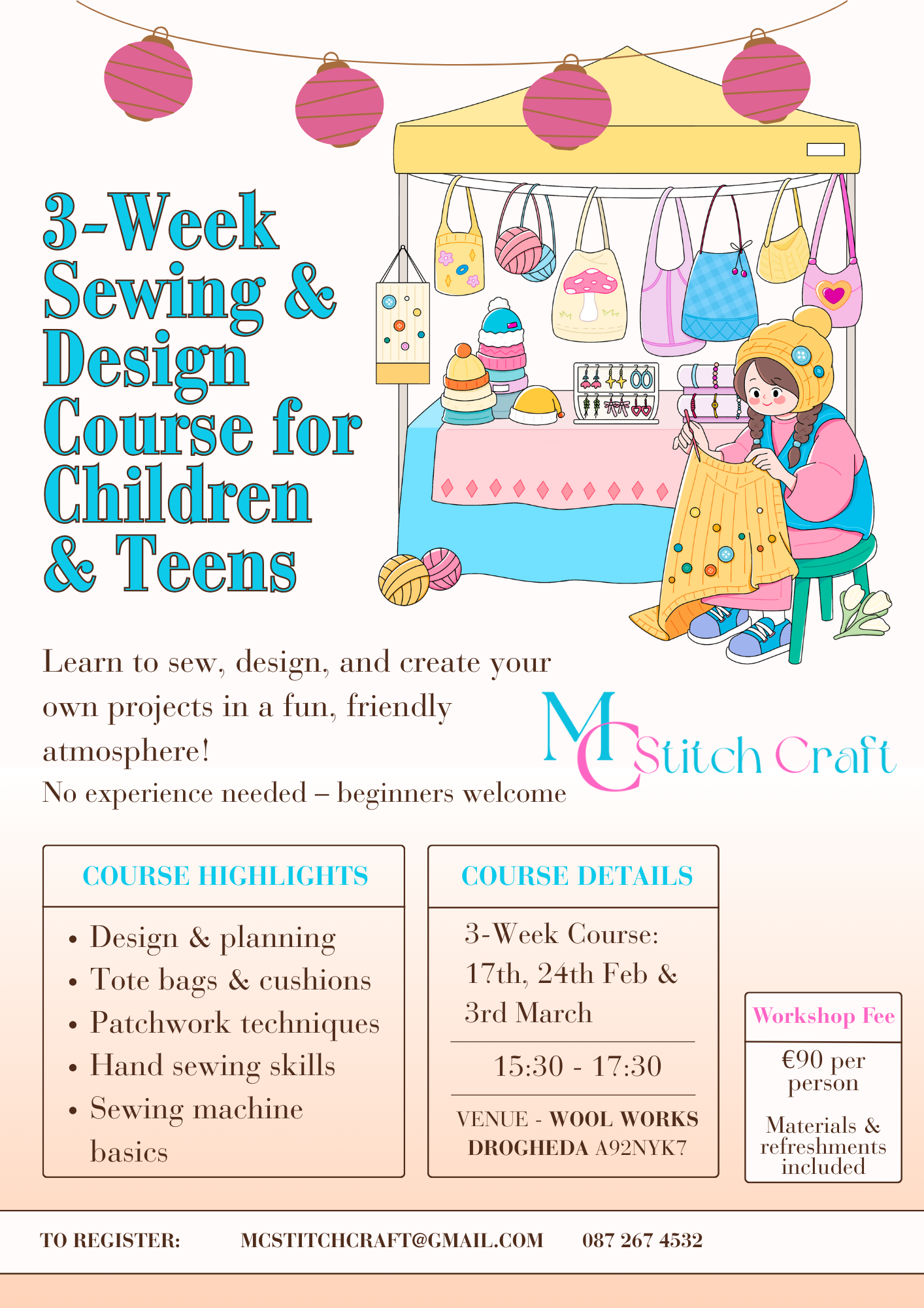 A hands-on sewing workshop at MC Stitch Craft in Drogheda, where beginners practice stitching techniques with expert guidance.