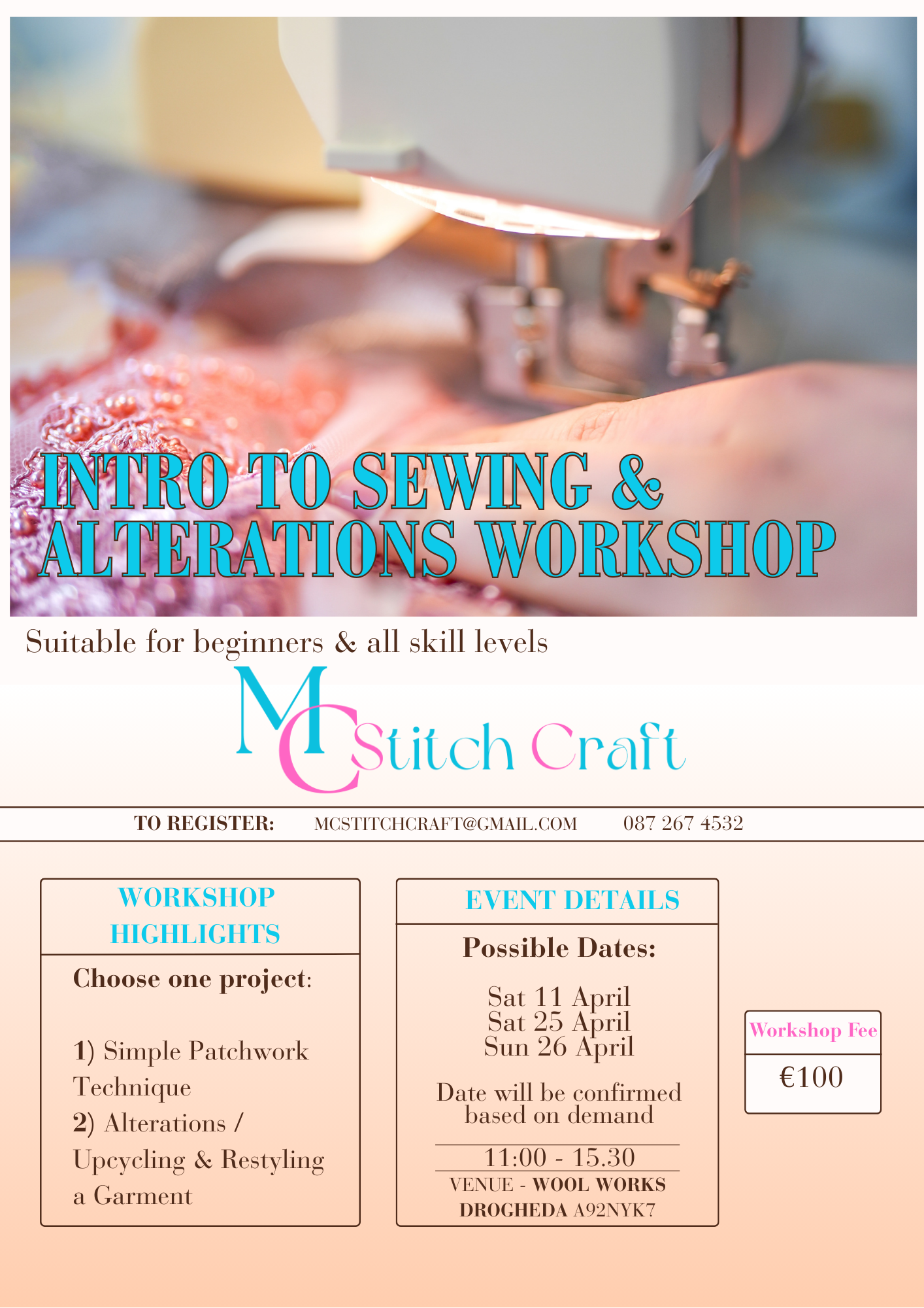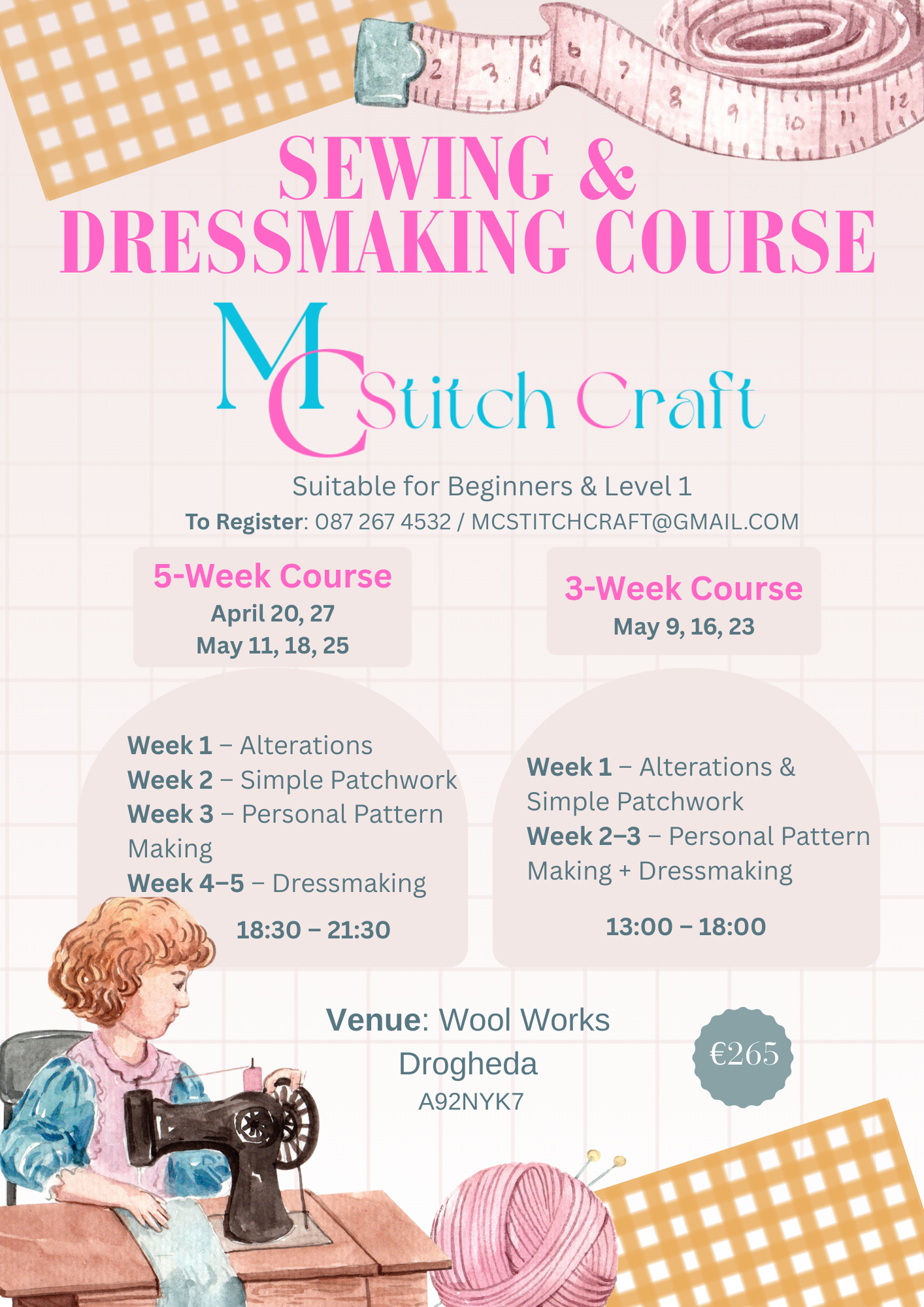 A hands-on sewing workshop at MC Stitch Craft in Drogheda, where beginners practice stitching techniques with expert guidance.